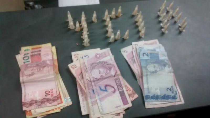 Durante busca pessoal localizou-se em uma pochete que carregava consigo uma porção de maconha e outra porção estava escondida em sua carteira, além de uma certa quantia em dinheiro em notas fracionadas.