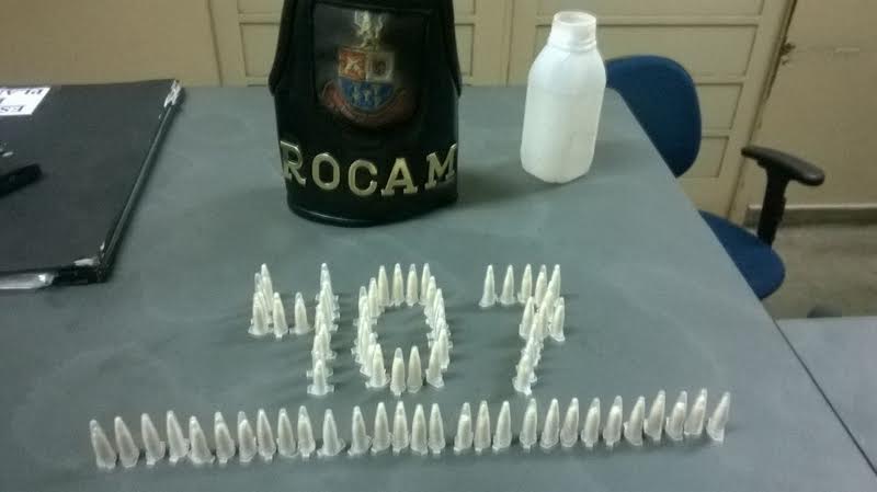 Ao ser abordado, os policiais encontraram com ele 7 eppendorfs com cocaína, e próximo a ele um pote plástico contendo mais 68 eppendorfs, também com cocaína.