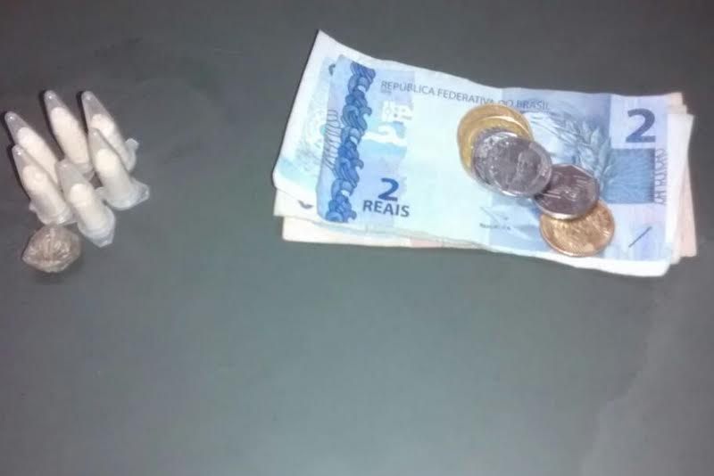 realizaram a abordagem no menor de 14 anos, localizando em suas vestes uma certa quantia em dinheiro em notas fracionadas, além de 06 eppendorfs com cocaína e uma porção de maconha. Indagado a respeito acabou confessando a prática do tráfico.