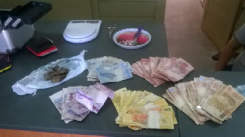 Diante dos fatos, foi realizada buscas na residência, sendo localizadas em um dos quartos, em cima de uma rack, cerca de sete porções de maconha, mais uma certa quantia e dinheiro. Os policiais também localizaram sacos plásticos, um prato com resquícios de droga e uma tesoura.