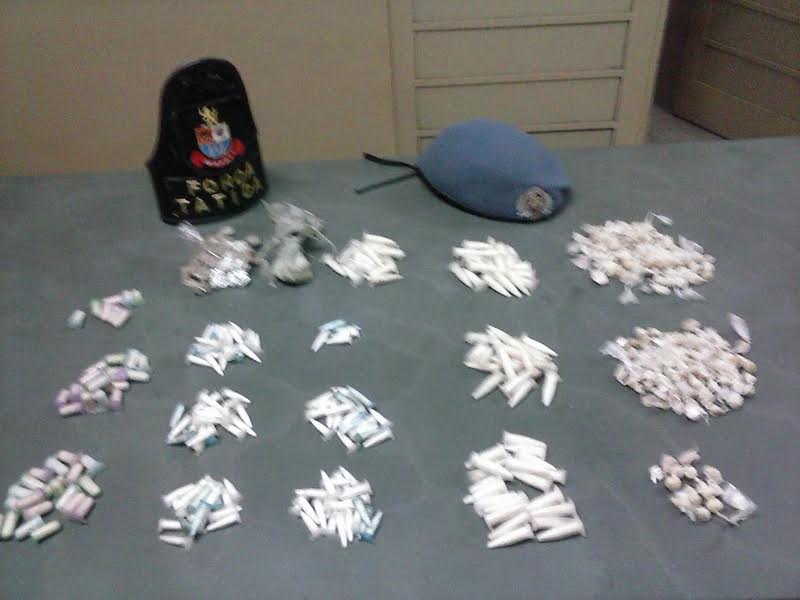 Por volta das 22 horas de domingo (30/11) policiais militares da Força Tática localizaram na Praça Cônego Octaviano Antônio Pavesi, bairro Cristo Redentor, 21 trouxinhas com maconha, 230 eppendorfs com cocaína, 215 pedras de crack e 16 gramas de um pó branco, que foi enviado para análise.
