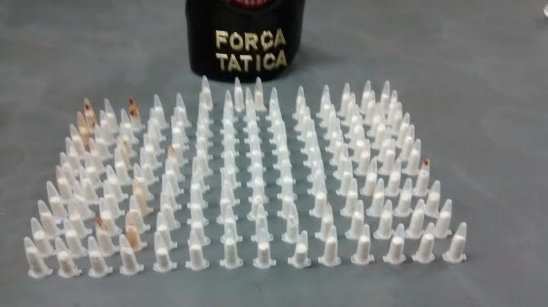 Os policiais perceberam que as mãos do menor estavam sujas de terra e resolveram realizar buscas em um terreno próximo onde ele estava, sendo encontrado mais cento e quarenta e três pinos com cocaína, que estavam enterrados.