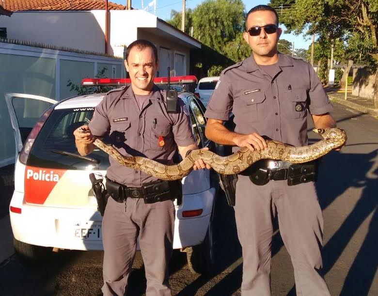 Os policiais militares foram acionados na segunda-feira (06) por volta as 17:00 horas, com a informação de que o solicitante saiu no quintal de sua oficina mecânica em Santa Rita do Passa Quatro, onde deparou com uma cobra jibóia de mais ou menos um metro e meio.
