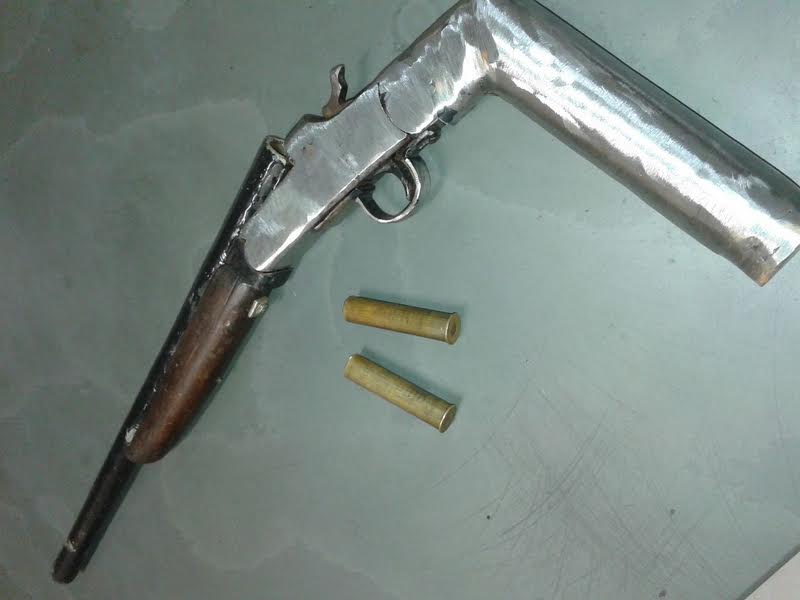 O jovem, ao perceber a aproximação das viaturas, tentou descer um barranco ali existente tentando fugir, porém foi abordado. Em seu bolso foi localizada uma munição de calibre 32 intacta. Em buscas no trajeto que o indivíduo fez para descer o barranco os policiais localizaram uma arma tipo cartucheira de cano serrado, calibre 32, municiada com um cartucho intacto.