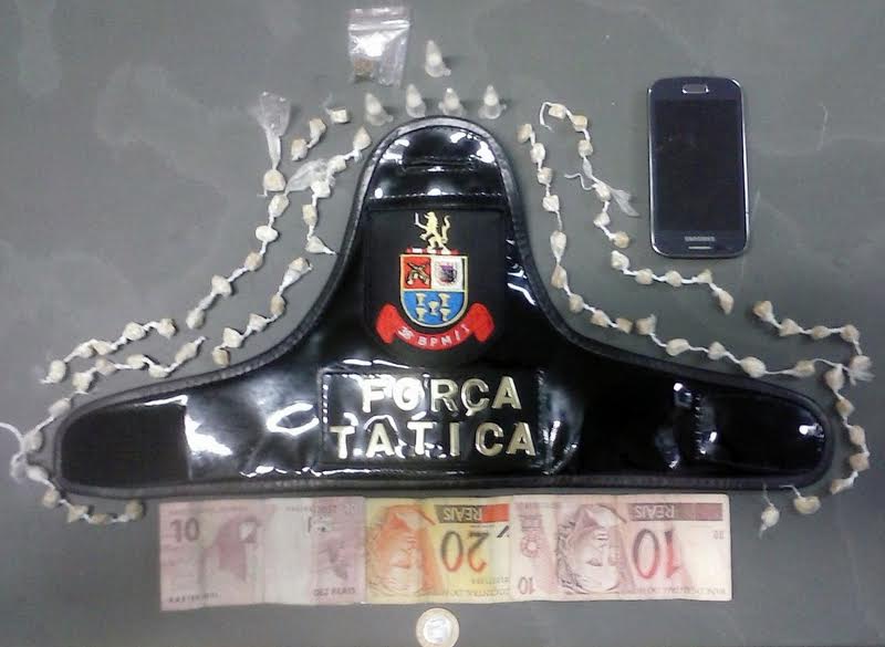 Em revista pessoal foi localizado no bolso do maior duas pedras de crack e uma trouxinha com maconha, além de uma certa quantia em dinheiro em notas fracionadas. Em buscas realizadas onde eles estavam foi localizada uma sacola, contendo mais 71 pedras de crack.
