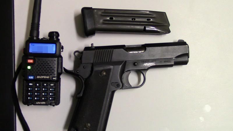 Por volta das 18h00, em buscas realizada na casa, os policiais civis localizaram em um dos cômodos da casa uma Arma de Fogo tipo Pistola da marca Imbel, calibre 380 com a numeração raspada, um carregador com oito cartuchos íntegros do mesmo calibre, um notebook, um rádio comunicador tipo HT ligado na frequência da Polícia Militar, e um par de tênis da marca New Balace, de procedência duvidosa.