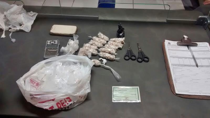 Todo o material foi apreendido, sendo: 0,11 kg de maconha, 0,265 kg de crack, uma balança de precisão e duas tesouras.