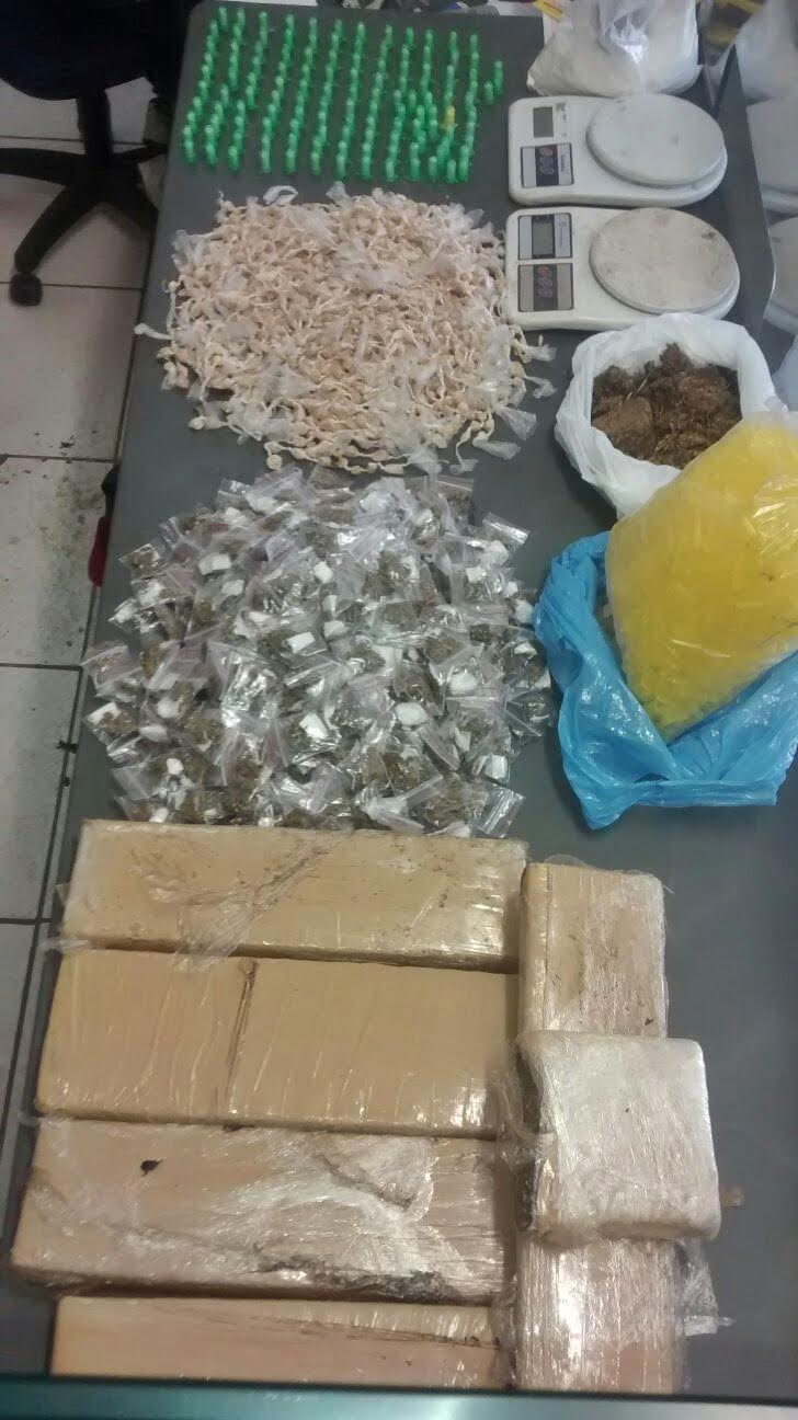 As drogas e os outros materiais foram apreendidos e apresentados na Delegacia de Polícia, sendo elaborado o Boletim de Ocorrência para demais providências.