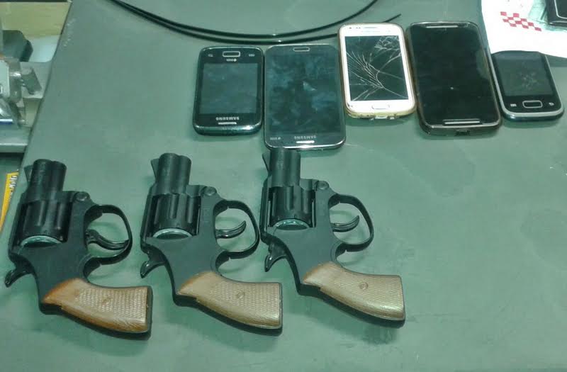 Em vistoria no carro em que eles se encontravam, com placa de Pirassununga, os policiais encontraram 3 simulacros de arma de fogo, 4 aparelhos celulares e dois pacotes de luvas cirúrgicas. Constatou-se também que o veículo estava sem a placa dianteira.
