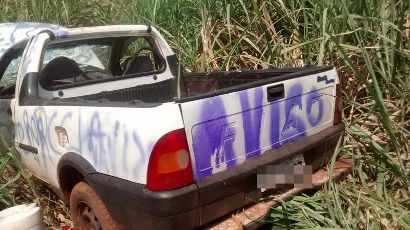 O cabo PM Novais e o soldado Eliton se dirigiram até a mencionada vicinal e localizaram próxima a Fazenda Santa Ritinha o Fiat Strada, totalmente danificado e pichado pelos meliantes.