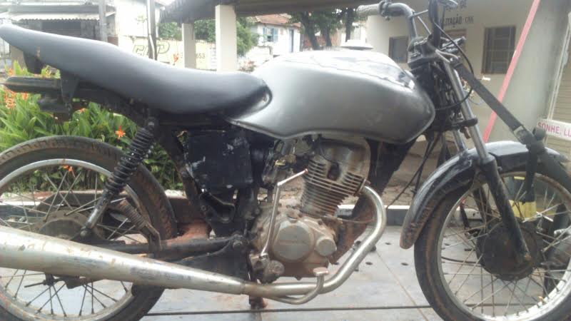 Imediatamente ele foi detido e levado para a sua casa, onde foram realizadas buscas, sendo encontrada no quintal estava uma moto CG 125 de cor prata encoberta por um lençol, com os números do chassi e motor raspados.
