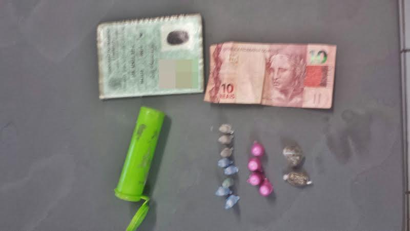 Ele foi avistado por volta das 15h39 na rua Manoel Carlos, Vila Maria, mesmo bairro onde reside, entregando alguma coisa para um motociclista. Diante daquela atitude suspeita, os policiais realizaram a abordagem, sendo localizado em suas mãos um tubo plástico, contendo 12 pinos com cocaína e 2 trouxinhas com maconha.