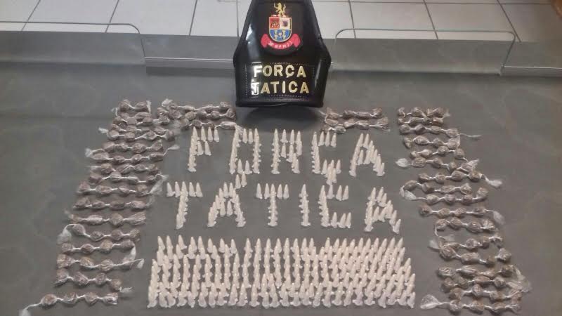 Os policias realizaram buscas do local em que o homem se encontrava e localizaram duas sacolas plásticas, uma contendo 156 invólucros com maconha e outra contendo 337 pinos com cocaína.
