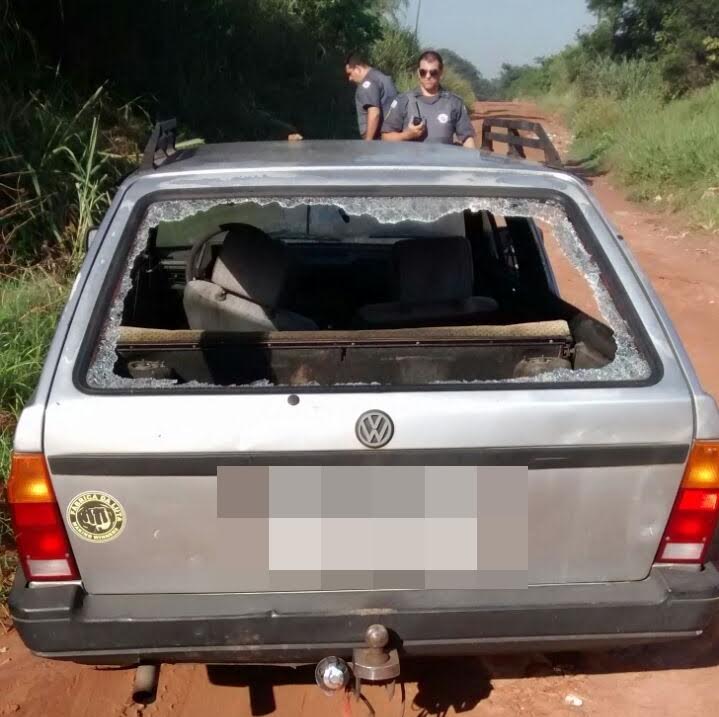 O veículo estava com os vidros laterais traseiros e dianteiros quebrados e com danos diversos na lataria;