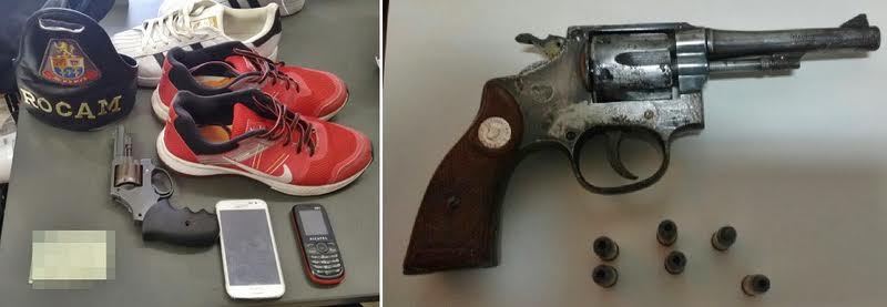 Na primeira ocorrência, policiais da equipe ROCAM (Rondas Ostensivas com Apoio de Motocicletas) que se encontravam em patrulhamento pela área central da cidade com vistas a um indivíduo que havia praticado rouboas a estabelecimentos comerciais abordaram por volta das 11h45 na rua Daniel de Oliveira Carvalho um desocupado de 31 anos que estava transitando com uma moto Honda Biz. Ao ser submetido em revista pessoal, foi localizado em sua cintura uma arma de fogo tipo Revólver oxidado, calibre 32 sem numeração aparente. Diante do fato o homem recebeu voz de prisão em flagrante, sendo detido e levado para a Delegacia de Polícia para providências. Os policias realizaram buscas na casa deste indivíduo e localizaram um aparelho celular. Consultado o número do EMEI, verificou-se que o celular era produto de Roubo. Também foi verificado que contra o homem homem pesava um Mandado de Prisão expedido pela Justiça de Porto Ferreira, por não pagamento de pensão alimentícia. A arma de fogo foi apreendida, o aparelho celular será devolvido à vítima e o indiciado foi mandado para a Cadeia na cidade de São Carlos, onde permaneceu preso à disposição da Justiça.