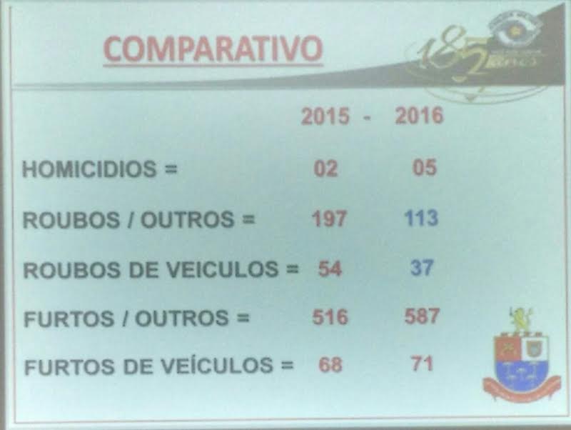 Foi dado destaque para a redução dos números de Roubos e Roubos de Veículos em 2016, em comparação a 2015.