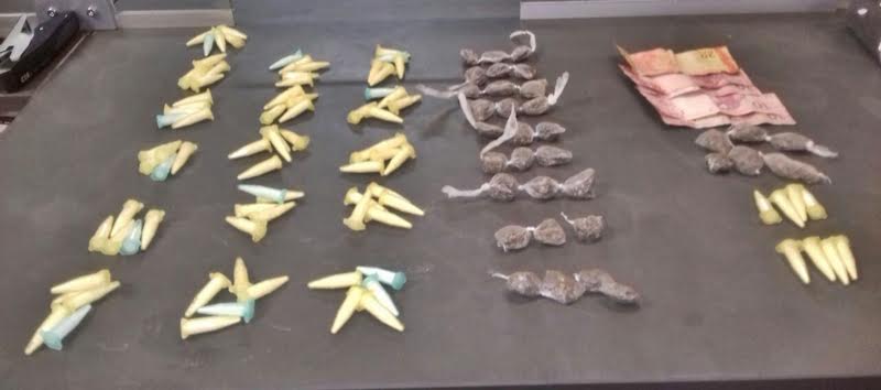 Por volta das 20 horas uma equipe da Força Tática se encontrava pelo bairro Cristo Redentor em patrulhamento de repressão ao tráfico quando avistou pelo cruzamento da rua Sebastião Crippa com a rua Naif José um menor de 16 já conhecido dos meios policiais em atitude suspeita. O menor, morador no Jardim Vitória, foi rapidamente abordado, sendo localizado em seu poder uma certa quantia em dinheiro em notas diversas e próximo aos seus pés 08 pinos com cocaína e 06 invólucros com maconha. Em buscas nas imediações de onde ele estava, próximo a uma igreja, foram encontrados mais 80 pinos com cocaína e 28 invólucros com maconha. Diante dos fatos, o menor recebeu voz de apreensão por Tráfico de Drogas, sendo detido e levado para a Delegacia para providências.