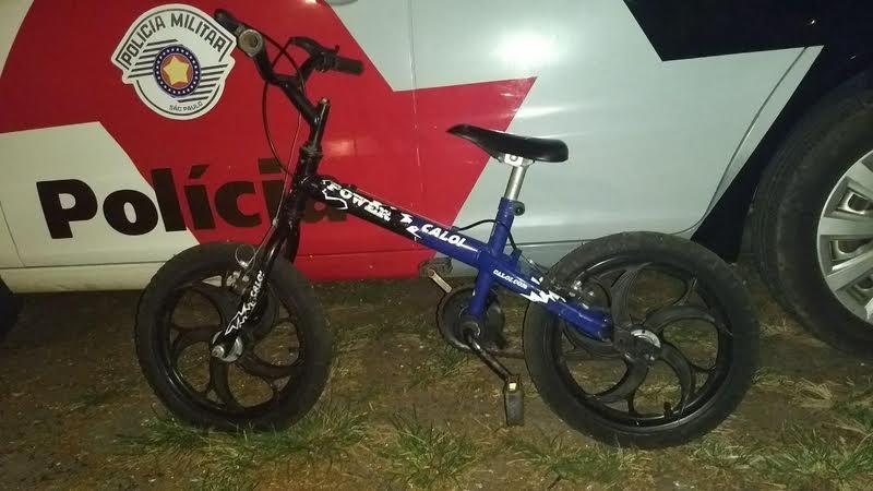 O homem de 49 anos foi abordado e localizado dentro deste saco uma bicicleta infantil da marca Caloi de cor azul. Indagado a respeito, disse que comprou tal objeto de um desconhecido pelo valor de R$ 25,00.