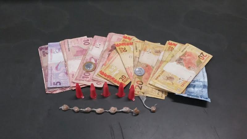 Em revista pessoal no adolescente, os policiais localizaram em seu poder, cinco pinos contendo cocaína, oito pedras de crack, e uma certa quantia em dinheiro.
