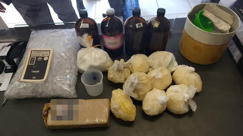 Foram apreendidos: 1,278 Kg de cocaína; 0,622 Kg de maconha; 1.200 eppendorfs para embalagem de droga; 1 caderno de anotações do tráfico; 1 Litro de éter; 1 litro de acetona e 0,639 Kg de ácido bórico. Todo o material foi levado para a Delegacia de Polícia, sendo elaborado o Boletim de Ocorrência da Polícia Civil para demais providências de investigação.