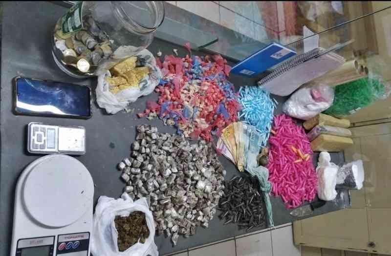 Durante vistoria no imóvel foi localizado 956 pinos contendo cocaína, totalizando 1.180 kg, mais uma porção para ser embalada pesando 1.202 kg, 1.140 trouxinhas contendo crack, pesando 485 gramas e mais uma porção para ser embalada pesando 192 gramas, 491 trouxinhas contendo maconha, pesando 1.085 kg e mais 3 tijolos pesando 2.397 kg e mais 146 pinos contendo maconha sintética K9 pesando 135 gramas.
