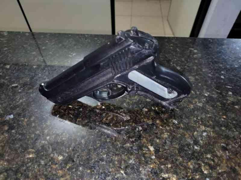Em buscas no carro, foi localizado um simulacro de arma de fogo caído no assoalho do motorista, o qual também foi reconhecido pelas vítimas como armamento utilizado para ameaçá-lo no roubo. A vítima, ainda relatou que chegava em sua residência com sua filha de 10 anos e mediante grave ameaça com arma de fogo foi rendido e logo em seguida sua esposa que chegava no veículo Ford Ecosport também foi rendida.