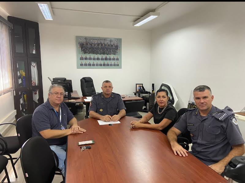 Tenente Coronel Mussolini, Débora Blanco dirigente Regional e Capitão Gonçalves e Sr Bellonci da Secretaria de Segurança Municipal estiveram em reunião de trabalho para realinhar ações e estratégias de segurança nas escolas da cidade de São Carlos e região.