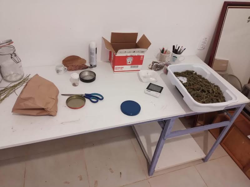 Foram também realizadas buscas em imóveis próximos onde os policiais constataram que, no quintal de uma delas havia uma plantação de cannabis sativa, sendo também abordado um individuo, onde no interior desta casa foi localizada uma estrutura para a produção e embalo de maconha, com medidor de temperatura, estufa, balança, máquina seladora para o embalo da droga, entre outros objetos, inclusive um simulacro de pistola.
