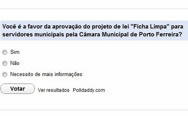 Foi encerrada ontem (26/11), a enquete intitulada “Você é a favor da aprovação do projeto de lei “Ficha Limpa” para servidores municipais pela Câmara Municipal de Porto Ferreira?”. No total, 1.002 internautas manifestaram livremente sua opinião sobre o projeto, que encontra-se para apreciação pelo legislativo ferreirense.
