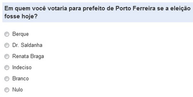 O Porto Ferreira Hoje disponibiliza a partir de hoje uma enquete com o título “Em quem você votaria para prefeito de Porto Ferreira se a eleição fosse hoje?”.