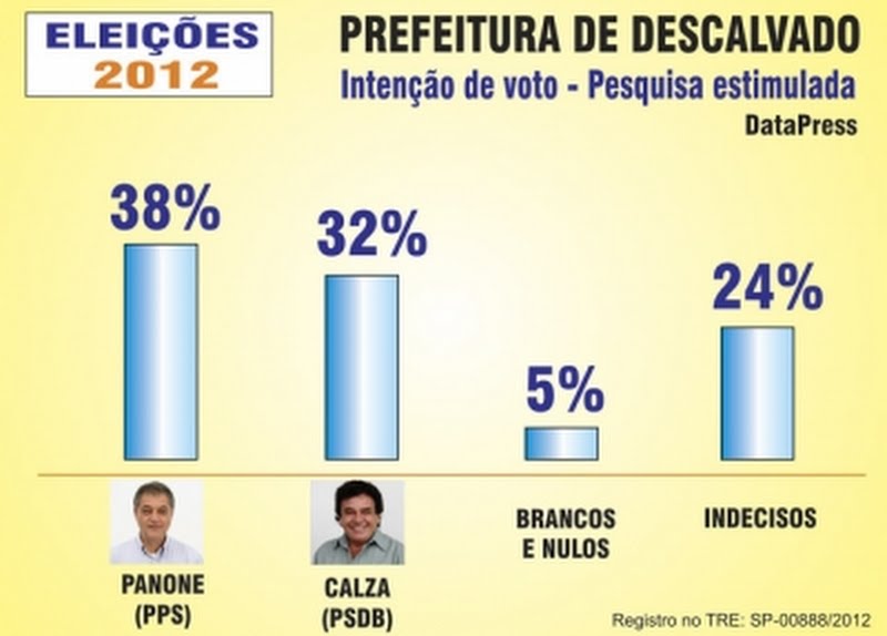 A pesquisa realizada pelo instituto Data Press de Araraquara tem margem de erro de 3% para mais e para menos. A pesquisa foi realizada no último dia 6 de setembro com 271 eleitores de Descalvado que corresponde a 1,10% da população politicamente ativa.