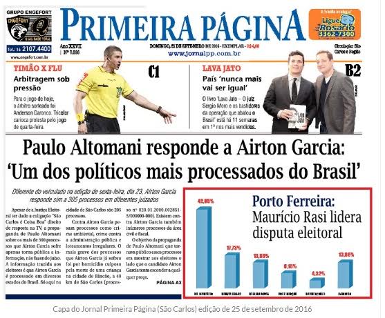 O Jornal Primeira Página, da cidade São Carlos, que cobre toda a nossa região, divulgou na edição ontem, domingo, dia 25 de setembro de 2016, uma pesquisa sobre a intenção de votos da população ferreirense para o próximo prefeito de Porto Ferreira.