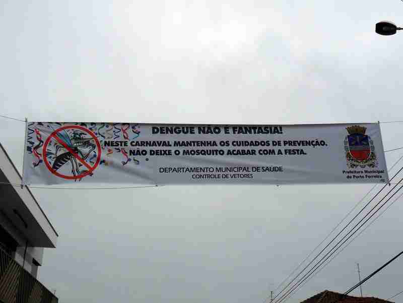A Equipe de Controle de Vetores colocou uma faixa alertando para o combate ao mosquito da dengue no ponto de início dos desfiles do Carnaval 2011 de Porto Ferreira, na Rua Cel. João Procópio.