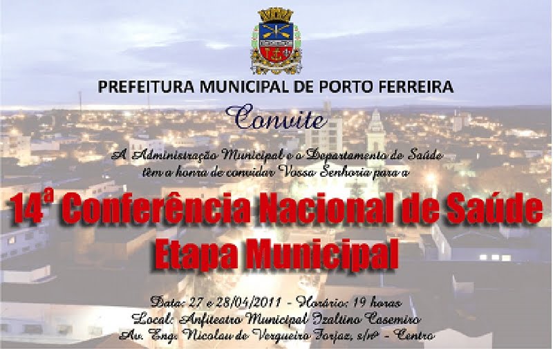 A Administração Municipal e o Departamento de Saúde convidam a população ferreirense para a etapa municipal da 14ª Conferência Nacional da Saúde, marcada para os dias 27 e 28 de Abril, no Anfiteatro Municipal Izaltino Casemiro, a partir das 19 horas.