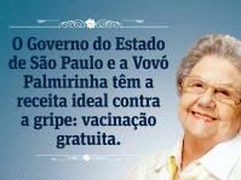 Personalidade carismática da televisão, Palmirinha Onofre será a estrela da campanha de vacinação contra a gripe no Estado de São Paulo. Aos 80 anos, Vovó Palmirinha, como agora quer ser chamada, vai estar em folderes e cartazes que o governo paulista distribuirá para os postos de saúde, farmácias, hospitais, supermercados, terminais de ônibus e estações de metrô, entre outros locais.