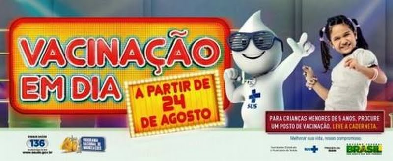 No sábado, dia 24, das 8 às 17 horas, as Unidades de Saúde estarão abertas para atualização das vacinas em atraso, para todas as crianças menores de 5 anos de idade.