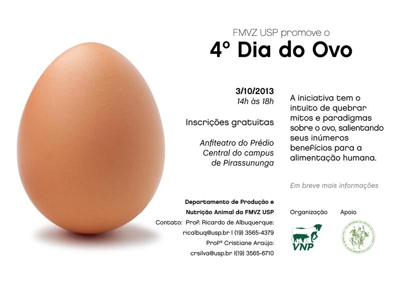 Para registrar o Dia Mundial do Ovo, a Faculdade de Medicina Veterinária e Zootecnia – FMVZ/USP, em colaboração com o Instituto Ovos Brasil, promove no dia 03 de outubro próximo, o 4.º Dia do Ovo da USP de Pirassununga.