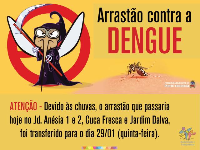 Em virtude das chuvas, o arrastão contra a dengue previsto para passar hoje (sexta-feira) nos bairros Jardim Anésia 1 e 2, Cuca Fresca e Jardim Dalva foi transferido para a próxima quinta-feira, dia 29 de janeiro.